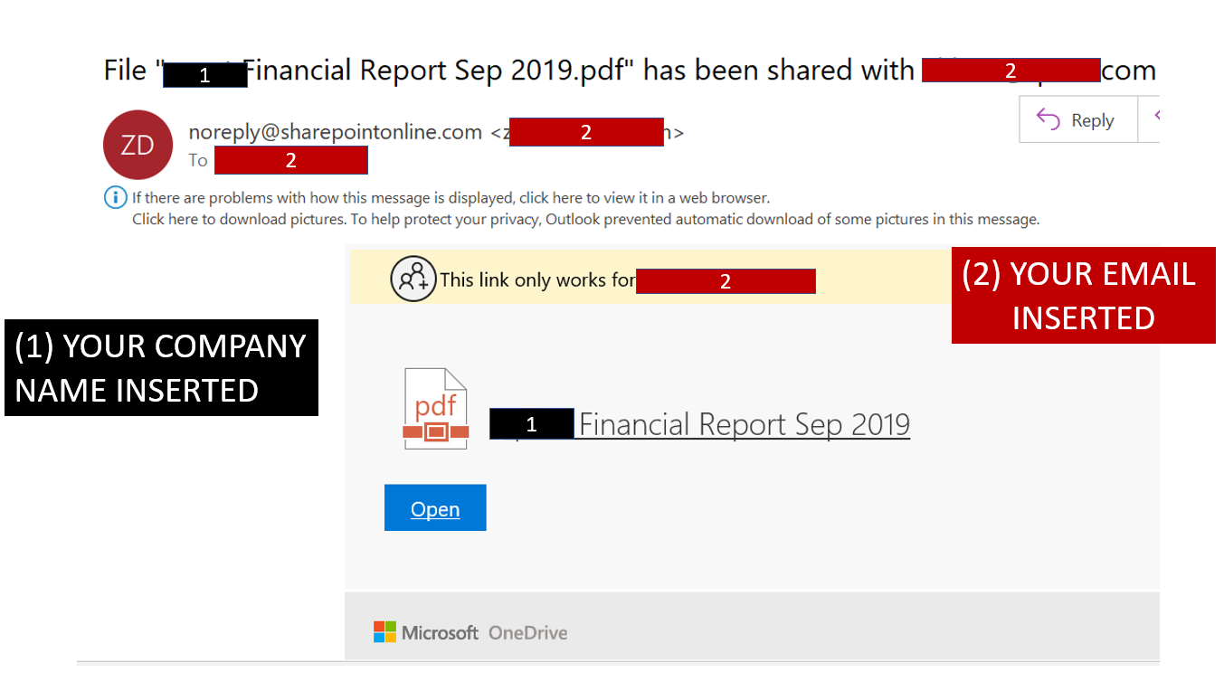 Armed with better grammar and embedding your company name and email address within the email and images, and further, using authentic OneDrive or Dropbox URLs to link to, these latest scammers are luring users into providing their username and passwords to the scammers.
