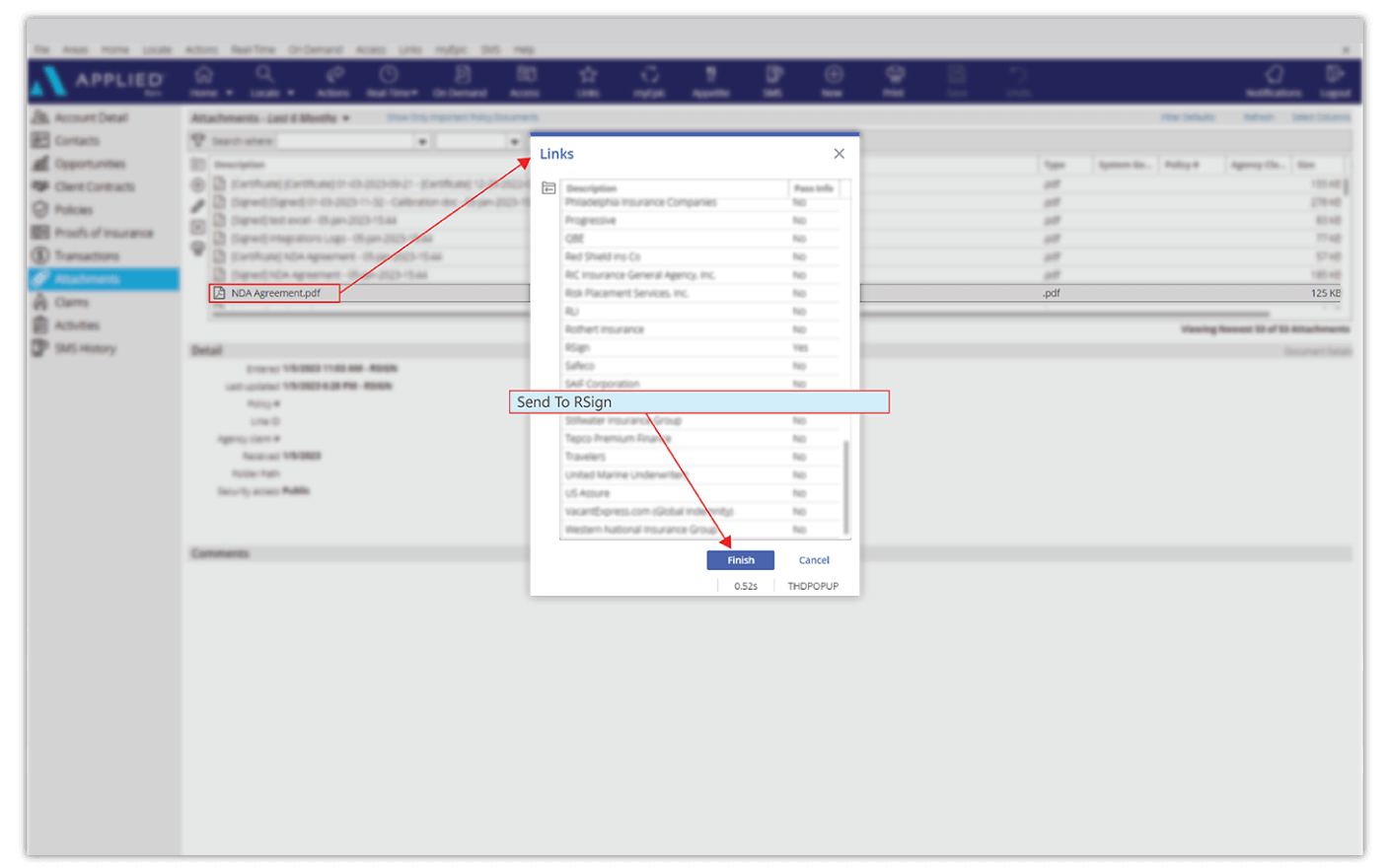 Speed completion of lengthy forms with guided form filling and prefill capabilities, support multiple signers in sequence or parallel, and request attachments from signers, directly in the envelope. Automatically route final policy documents to the right parties, protect access with authentication, and integrate with Applied Epic, Eclipse, Nexsure, and other insurance platforms. With robust audit trails and flexible retention, RSign reduces friction and fraud risk, accelerating time-to-issue while preserving data integrity.