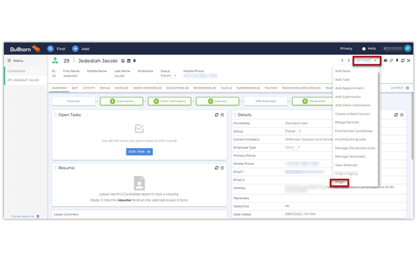 Standardize onboarding with Templates that bundle multiple documents, apply Rules for standardized forms, and use conditional fields to show only what’s relevant. Connect RSign to the most popular ATS platforms, such as Bullhorn or Vincere, to prefill candidate data, easily send, sync status, and archive final PDFs, reducing manual steps and delivering a first-day-ready experience.